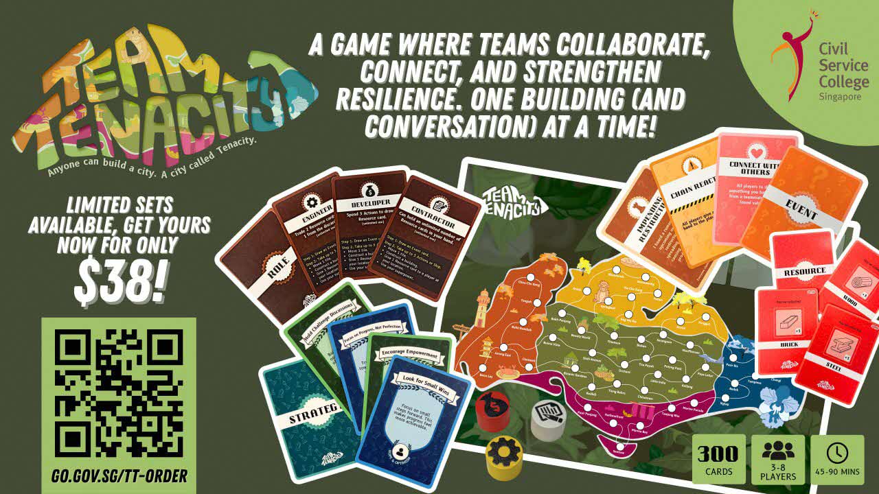 This game was created and produced by our team of learning designers from the Institute of Leadership & Organisation Development, Civil Service College in November 2025. We developed Team TenaCity to give teams an easy, engaging way to foster stronger relationships, build resilience, and learn problem-solving strategies (all inspired from positive psychology research) that improve both performance and well-being at work.